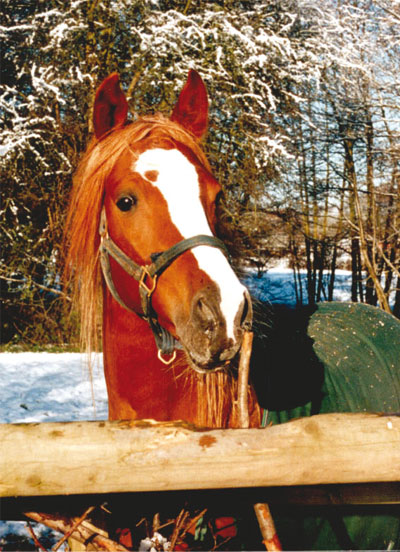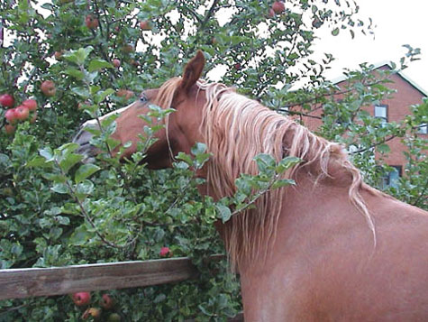 Chesnut Stallion with flaxen mane and tail. Born April 1992. 16 hands