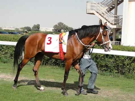 A relaxed Krayaan Haddj in the pre-race parade ring showing his grandsire's (Krayaan Dilmun's) laid back approach to life despite the hustle and bustle of race day in Bahrain.